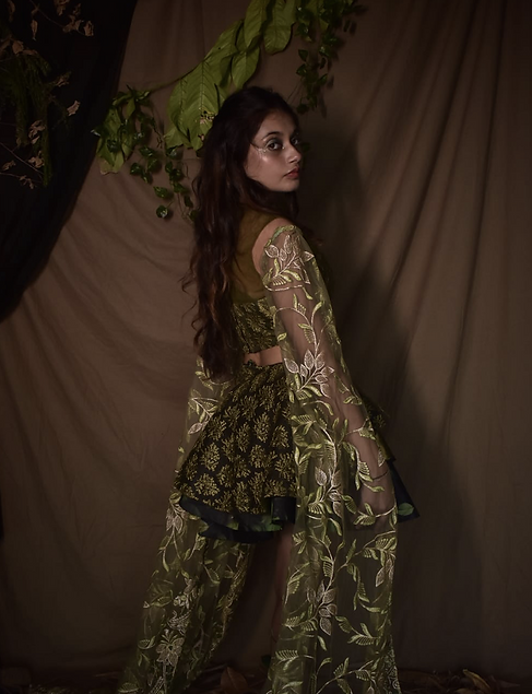 Embracing the essence of Mother Earth, the collection, 'SAMSARA,' explores the dual aspect of creation and destruction that ultimately proves an intricate balance of universe. Drawing inspiration from the fundamental elements of the universe, we present a narrative that celebrates the dual characteristic of nature which is ‘if it can create something, it can destroy it as well. Earth, among the elements of the universe, would be used to illustrate construction whereas fire, another element of the universe, would be used to illustrate destruction At the heart of our theme lies the concept of transition. Representing the constructive force, Earth is depicted through vibrant greens transitioning into the fiery reds of destruction. Utilizing printed and dyed organza fabrics in the shades of red and green, our garments would capture the seamless interplay between Earth and fire.